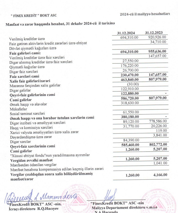 Bank Olmayan Kredit Təşkilatı “Finex Kredit” Açıq Səhmdar Cəmiyyəti 2024-cü ili 1260 manat xalis mənfəət ilə başa vurub. Kredit təşkilatı 2023-cü ili 4166 manat xalis mənfəət ilə bağlamışdı.