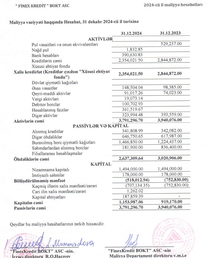 2023-cü ilin sonunda BOKT “Finex Kredit”in cəmi aktivləri 3 milyon 840 min manat ikən, 2024-cü ilin sonunda 3 milyon 791 min manat olub.