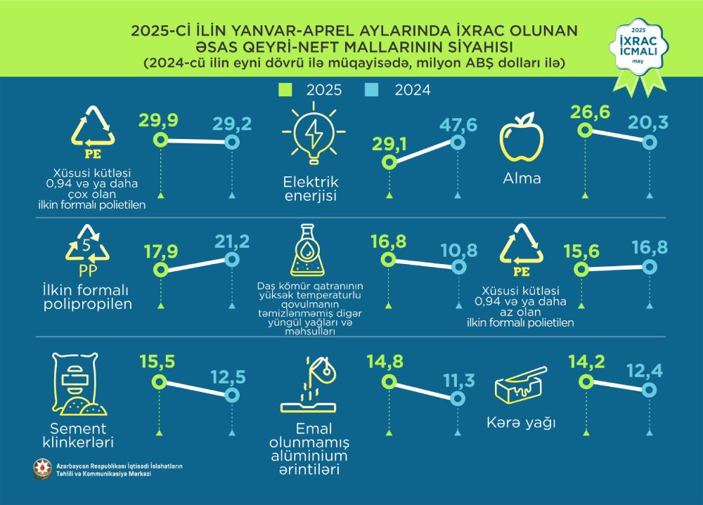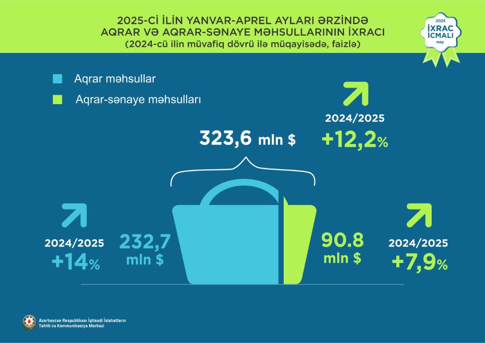 İcmala əsasən, 2025-ci ilin yanvar-aprel aylarında Azərbaycanın qeyri-neft sektoru üzrə ixracı 2024-cü ilin müvafiq dövrü ilə müqayisədə 18% artaraq 1,1 milyard ABŞ dolları təşkil edib. 2025-ci ilin yanvar-aprel aylarında yeyinti məhsullarının ixracı 12,1% artaraq 300,8 milyon ABŞ dollarına bərabər olub.