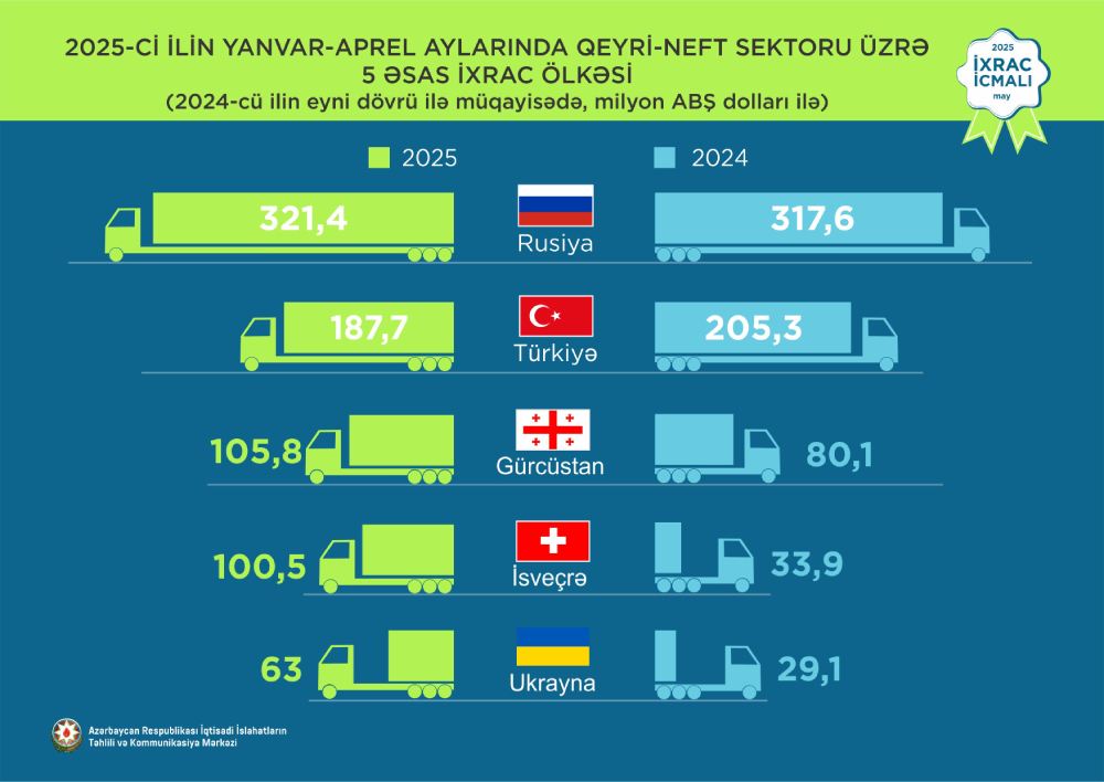 Cari ilin ilk dörd ayında Rusiya Federasiyasına 321,4 milyon ABŞ dolları, Türkiyəyə 187,7 milyon ABŞ dolları, Gürcüstana 105,8 milyon ABŞ dolları, İsveçrəyə 100,5 milyon ABŞ dolları, Ukraynaya isə 63 milyon ABŞ dolları dəyərində qeyri-neft sektoruna aid mal ixrac olunub.