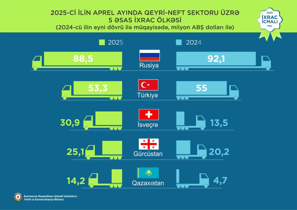 2025-ci ilin aprel ayında Rusiya Federasiyasına 88,5 milyon ABŞ dolları, Türkiyəyə 53,3 milyon ABŞ dolları, İsveçrə 30,9 milyon ABŞ dolları, Gürcüstan 25,1 milyon ABŞ dolları, Qazaxıstan isə 14,2 milyon ABŞ dolları dəyərində qeyri-neft sektoruna aid mal ixrac edilib.*