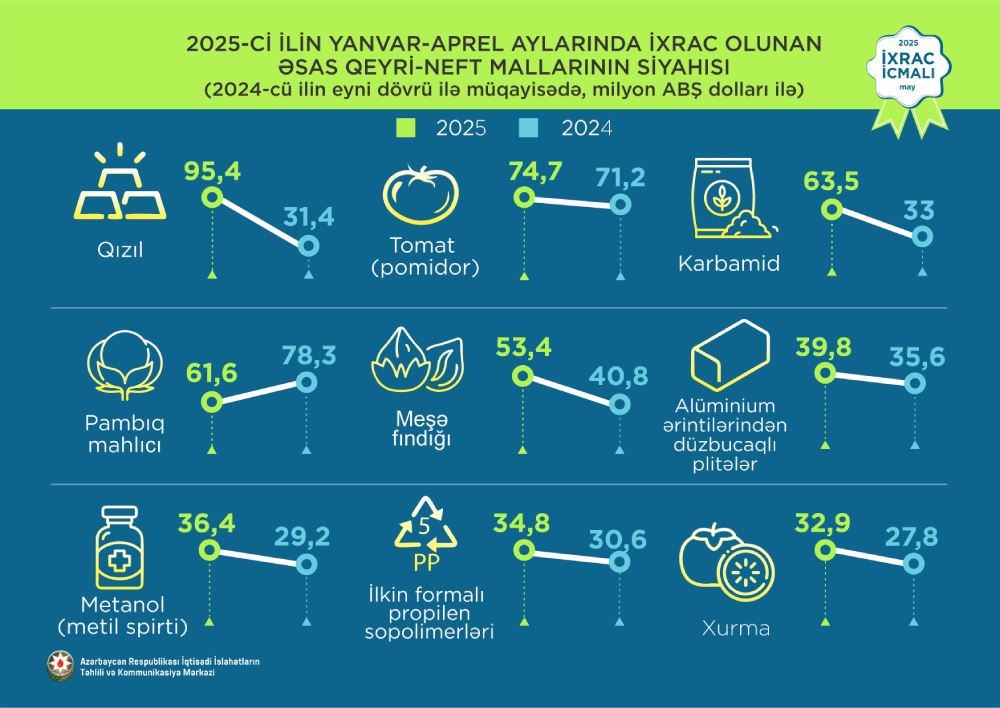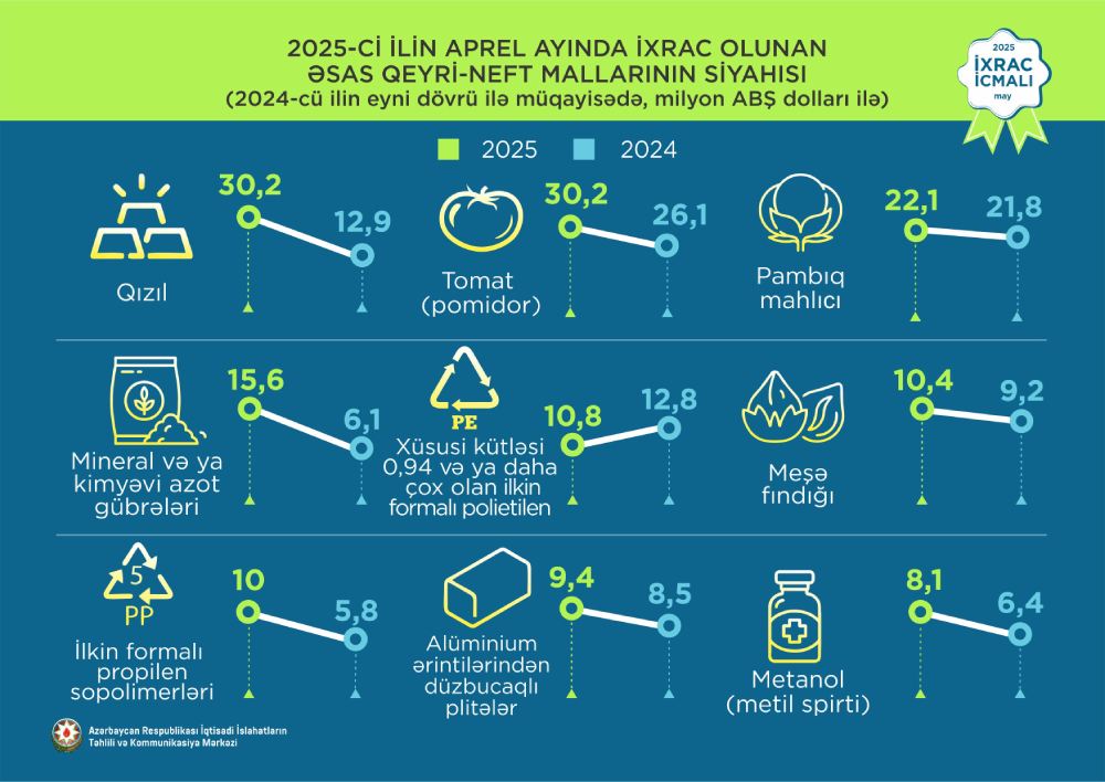 2025-ci ilin aprel ayı ərzində ixrac edilmiş qeyri-neft sektoruna aid malların siyahısında qızıl (30,2 milyon ABŞ dolları) birinci olub. Bu siyahıda pomidor (tomat) (30,16 milyon ABŞ dolları) ikinci, pambıq (22,1 milyon ABŞ dolları) isə üçüncü yerdə qərarlaşıb.