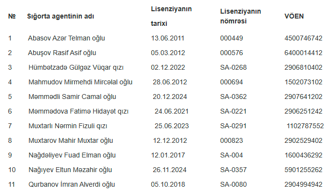 Qeyd edilib ki, Azərbaycan Respublikası Qanununun 106.1.10-cu maddəsinə əsasən müvafiq hesabatın təqdim edilməməsi ilə əlaqədar Azərbaycan Respublikası Mərkəzi Bankının 27 may 2025-ci il tarixli Qərarı ilə siyahıda adları qeyd edilən (siyahı əlavə olunur) 11 nəfər fiziki şəxs olan sığorta agentinə verilmiş lisenziyaların qüvvəsi 1 (bir) ay müddətinə dayandırılmışdır.