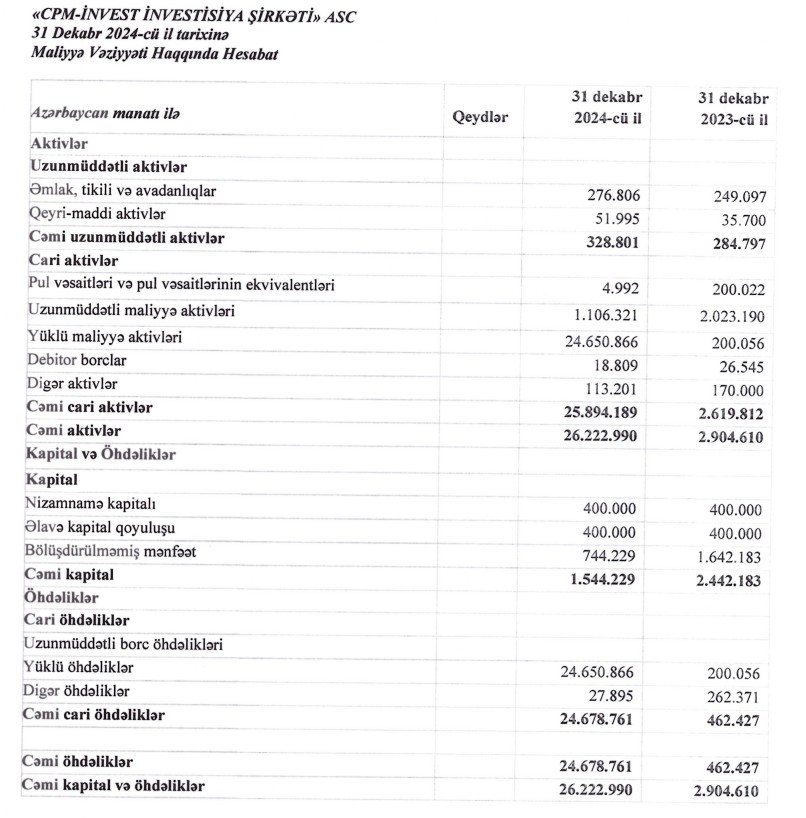 Marja.az Şirkətin illik maliyyə hesabatlarına istinadən xəbər verir ki, “CPM İnvest İnvestisiya Şirkəti”nin cəmi gəlirləri 2023-cü ildə 3 milyon 554 min manat ikən, 2024-cü ildə 2 milyon 507 min manata düşüb. Eyni dövrdə Şirkətin inzibati və digər əməliyyat xərcləri 795 min manat və ya 53% artaraq 2 milyon 297 min manat təşkil edib. Ötən il “CPM İnvest" 41 min manat mənfəət vergisi də ödəyib.
