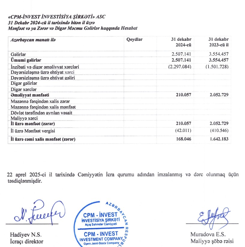 “CPM İnvest İnvestisiya Şirkəti” ASC 2024-cü ili 168 min manat xalis mənfəət ilə başa vurub. ASC 2023-cü ili 1 milyon 642 min manat xalis mənfəət ilə bağlamışdı. Beləliklə, “CPM İnvest"in xalis mənfəəti 2024-cü ildə 2023-ci illə müqayisədə təxminən 10 dəfə azalıb. “CPM İnvest İnvestisiya Şirkəti” 2021-ci ili 1 milyon 261 min manat xalis mənfəət ilə yekunlaşdırmışdı.