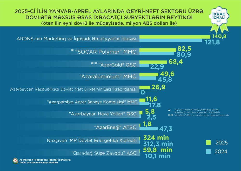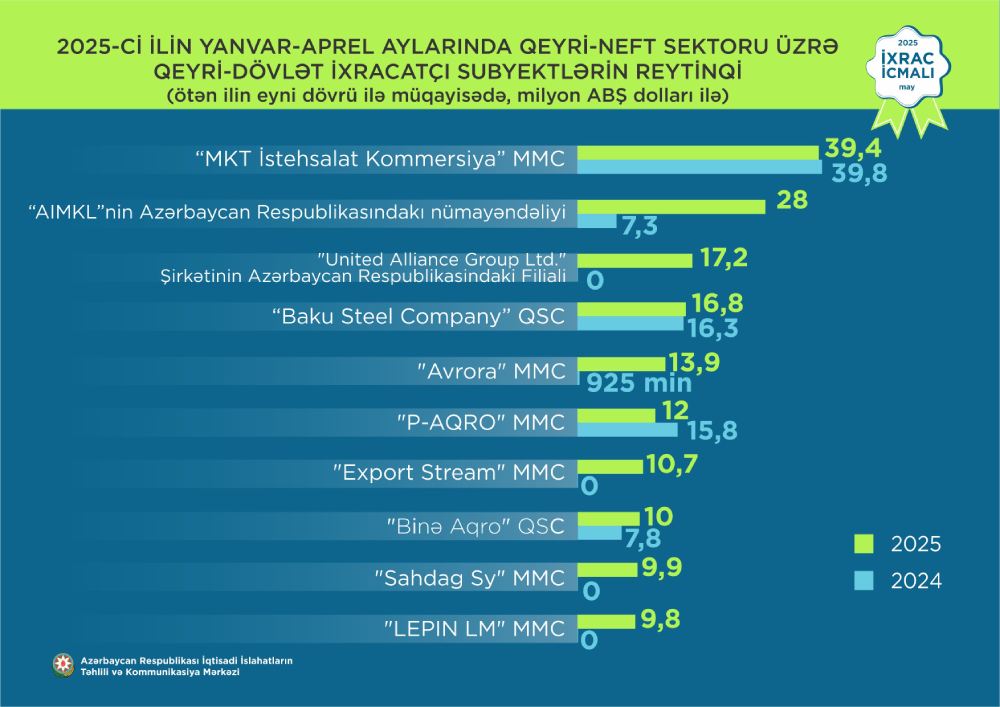 Marja.az-ın məlumatına görə, icmala əsasən, 2025-ci ilin yanvar-aprel ayları üzrə hazırlanmış qeyri-dövlət ixracatçı subyektlərin reytinqində ilk onluqda 4-cü yeri 16,8 milyon dollar ixrac həmi ilə "Baku Steel Company" QSC tutub.