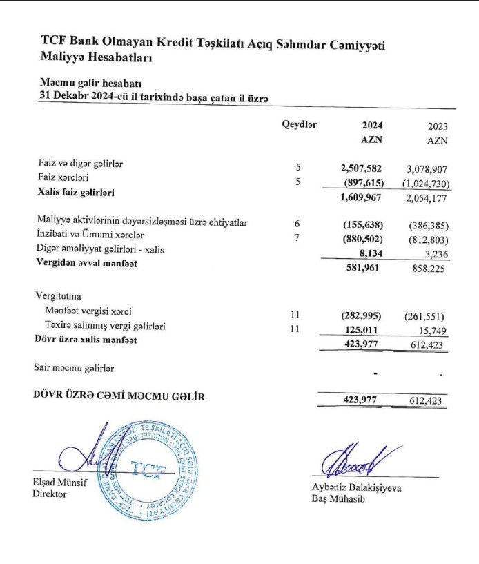 Marja.az təşkilatın maliyyə hesabatlarına istinadən xəbər verir ki, "TCF" BOKT ASC-nin faiz gəlirləri 2023-cü ildə 3 milyon 79 min manat ikən, 2024-cü ildə 2 milyon 508 min manata düşüb (571 min manat və ya 18,% azalıb).