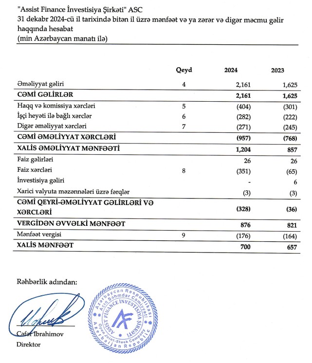 "Assist Finance İnvestisiya Şirkəti" ASC 2024-cü ili 700 min manat xalis mənfəət ilə başa vurub. Şirkət 2023-cü ili 657 min manat xalis mənfəətlə bağlamışdı. Beləliklə, "Assist Finance"ın xalis mənfəəti 2024-cü ildə 2023-cü illə müqayisədə 43 min manat və ya 6,5% artıb.