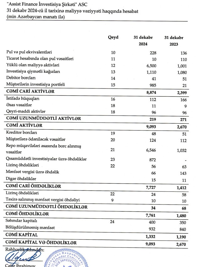 31 dekabr 2024-cü il tarixində "Assist Finance İnvestisiya Şirkəti" ASC 8 milyon 874 min manat cəmi aktivlərə malik olub. Şirkət 2023-cü ilin sonunda 2 milyon 399 min manat cəmi aktivlərə malik idi. Aktivlərin kəskin artması yüklü olan maliyyə aktivlərinin 6,5 dəfə artaraq 6 milyon 500 min manata yüksəlməsilə əlaqədardır.
