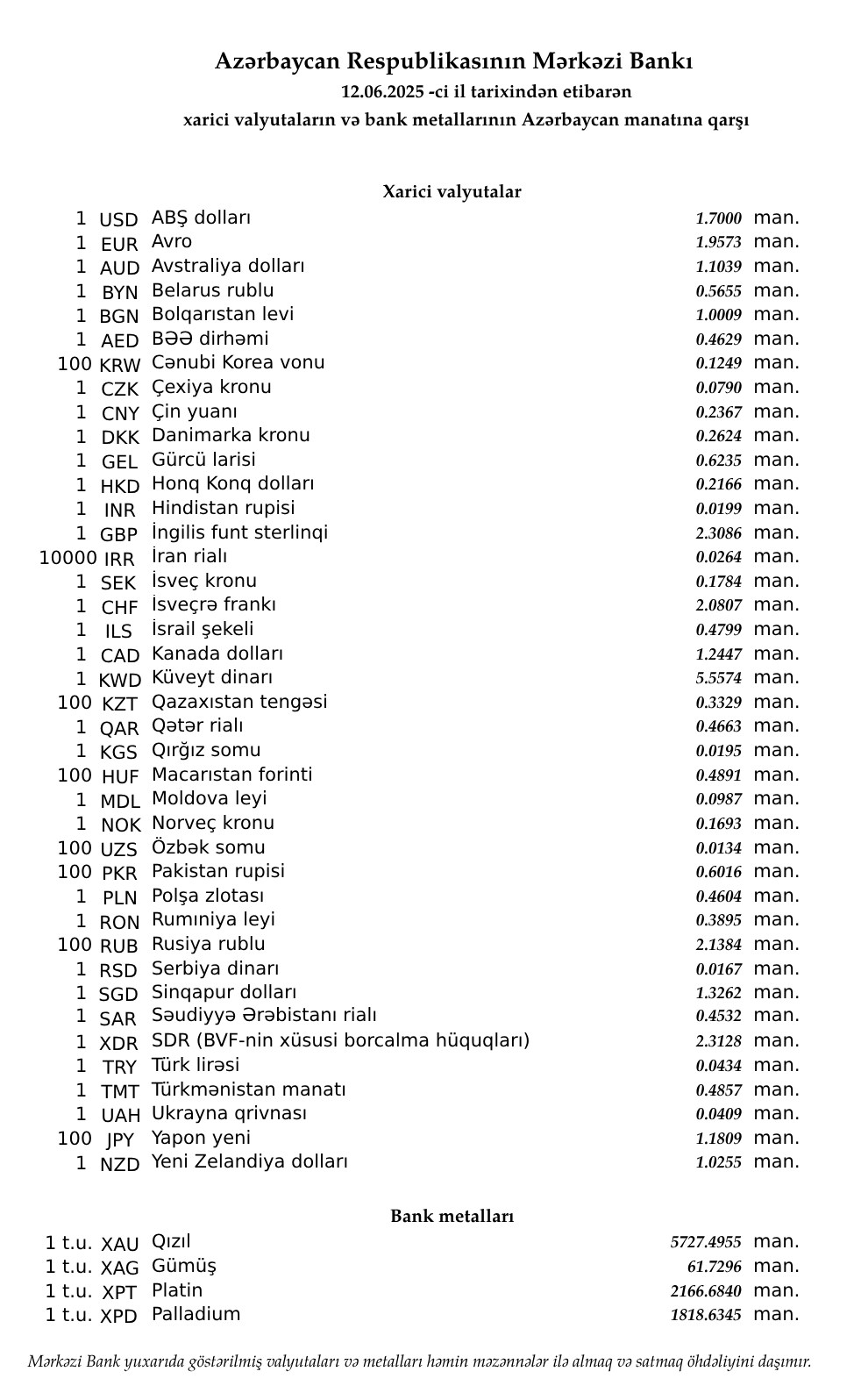 Rəsmi məzənnələr açıqlandı