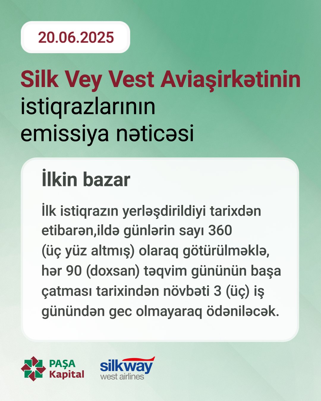 İnvestorlar illik 5.5%-dək gəlir qazanacaqlar.20 iyun 2025-ci il tarixində Bakı Fond Birjasında PAŞA Kapital-ın anderrayterliyi ilə Silk Vey Vest Aviaşirkətinə məxsus 10 milyon ABŞ dolları dəyərində istiqrazların II tranşı üzrə yerləşdirilməsi uğurla yekunlaşıb.