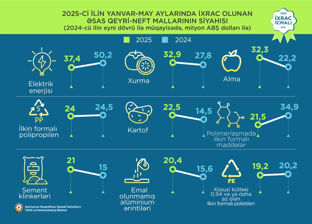 Marja.az İcmala istinadən xəbər verir ki,, 2025-ci ilin yanvar-may aylarında Azərbaycanın qeyri-neft sektoru üzrə ixracı 2024-cü ilin müvafiq dövrü ilə müqayisədə 11.6% artaraq 1,4 milyard ABŞ dolları təşkil edib. Bu dövrdə yeyinti məhsullarının ixracı 14,4% artaraq 417.7 milyon ABŞ dollarına bərabər olub.