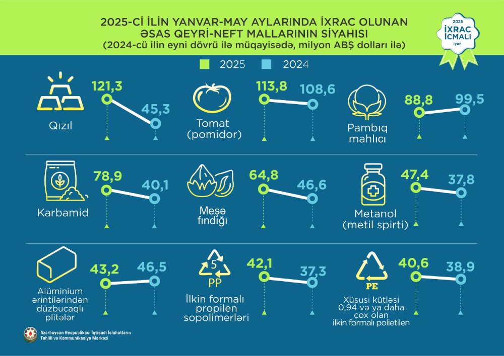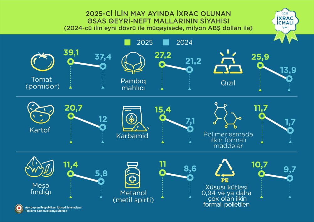 2025-ci ilin may ayında isə ixrac edilmiş qeyri-neft sektoruna aid malların siyahısında pomidor (tomat) (39,1 milyon ABŞ dolları) birinci olub. Bu siyahıda pambıq (27.2 milyon ABŞ dolları) ikinci, qızıl (25,9 milyon ABŞ dolları) üçüncü yerdə qərarlaşıb.