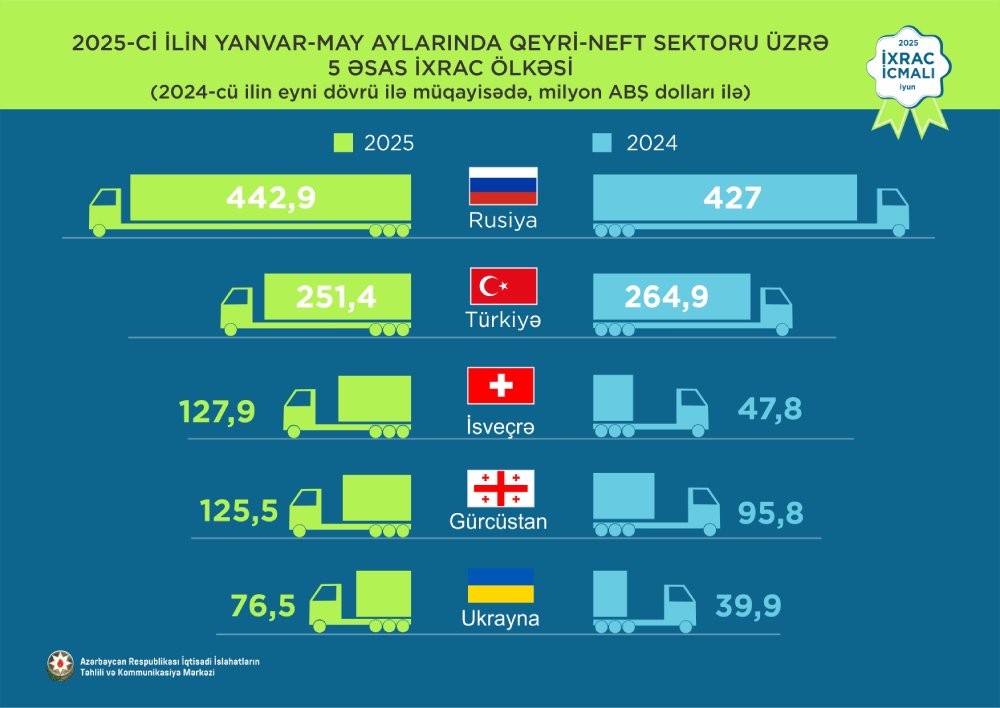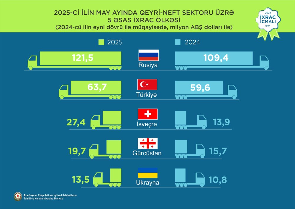 2025-ci ilin may ayında Rusiya Federasiyasına 121,5 milyon ABŞ dolları, Türkiyəyə 63,7 milyon ABŞ dolları, İsveçrəyə 27,4 milyon ABŞ dolları, Gürcüstana 19.7 milyon ABŞ dolları, Ukraynaya 13,5 milyon ABŞ dolları dəyərində qeyri-neft sektoruna aid mal ixrac edilib.
