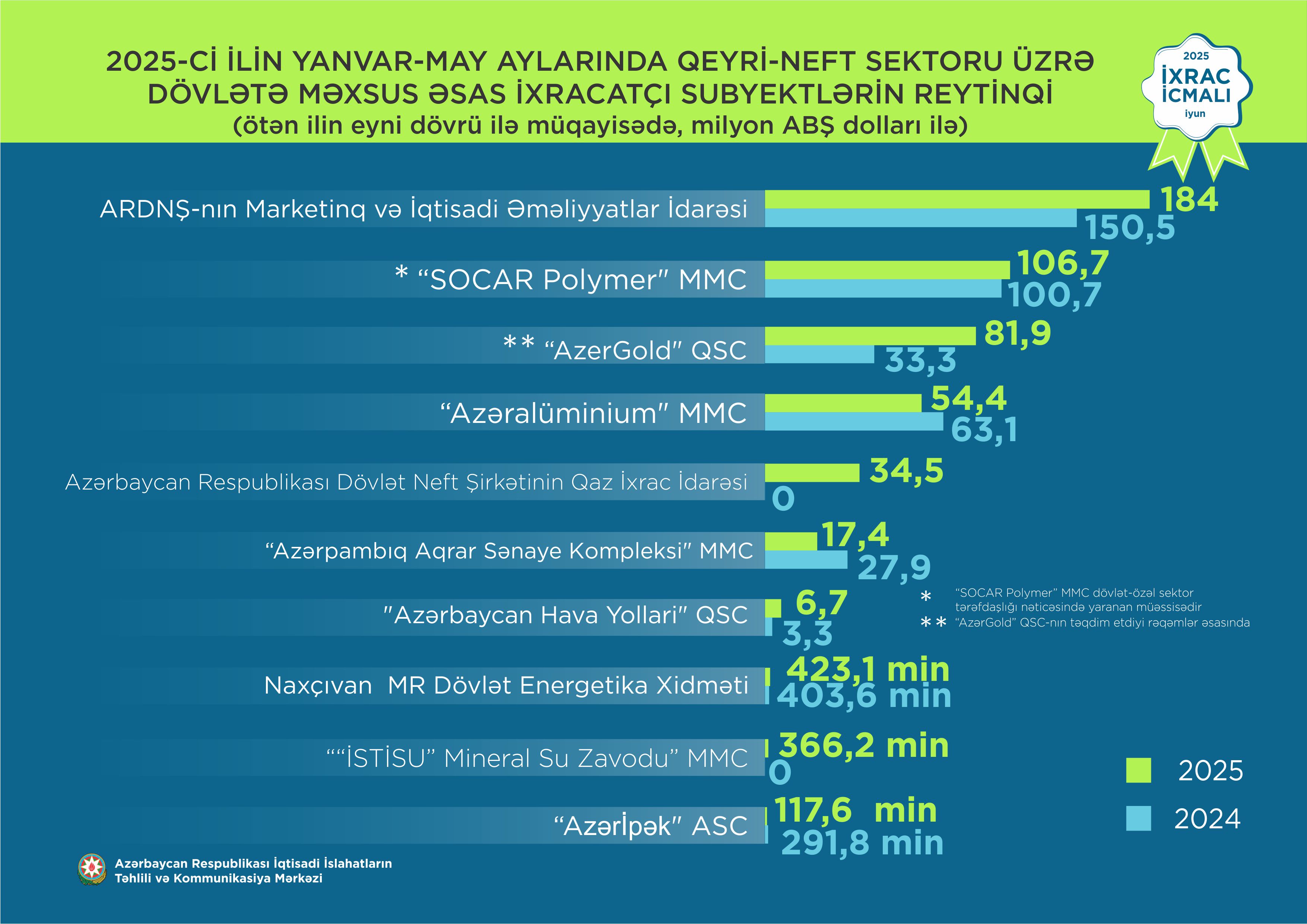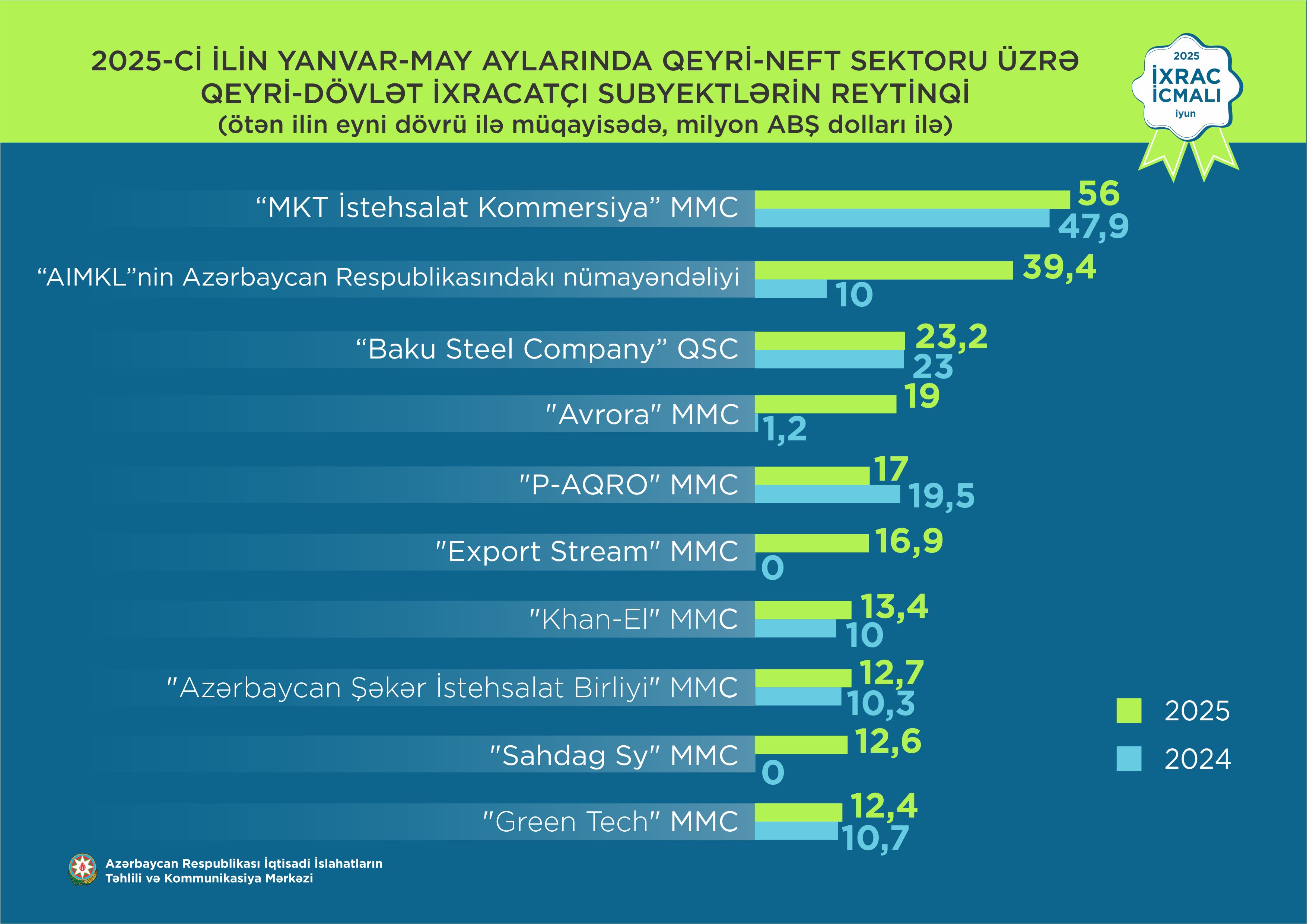 2025-ci ilin yanvar-may ayları üzrə hazırlanmış qeyri-dövlət ixracatçı subyektlərin reytinqində ilk onluqda aşağıdakı şirkətlər təmsil olunublar: “MKT İstehsalat Kommersiya" MMC,"Azərbaycan İnterneyşnl Mayninq Kompani Limited Şirkəti"nin Azərbaycan Respublikasındakı Nümayəndəliyi, "Baku Steel Company" QSC, "Avrora" Məhdud Məsuliyyətli Cəmiyyəti,"P-AQRO" MMC, "Export Stream" Məhdud Məsuliyyətli Cəmiyyəti, "Khan-El" MMC, "Azərbaycan Şəkər İstehsalat Birliyi"MMC, "Sahdag SY" Məhdud Məsuliyyətli Cəmiyyəti, "Green Tech" MMC.
