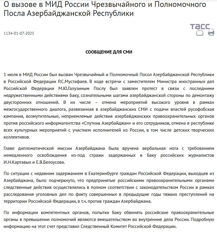 İyulun 1-də Azərbaycan Respublikasının Rusiya Federasiyasındakı fövqəladə və səlahiyyətli səfiri Rəhman Mustafayev Rusiya Xarici İşlər Nazirliyinə çağırılıb.