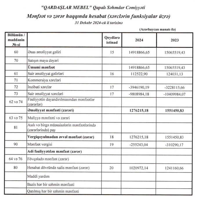 Azərbaycanın tanınmış mebel istehsalçısı "Qardaşlar Mebel" QSC 2024-cü ili 1 milyon 21 min manat xalis mənfəət ilə başa vurub. Şirkət 2023-cü ili 1 milyon 124 min manat xalis mənfəət ilə bağlamışdı.