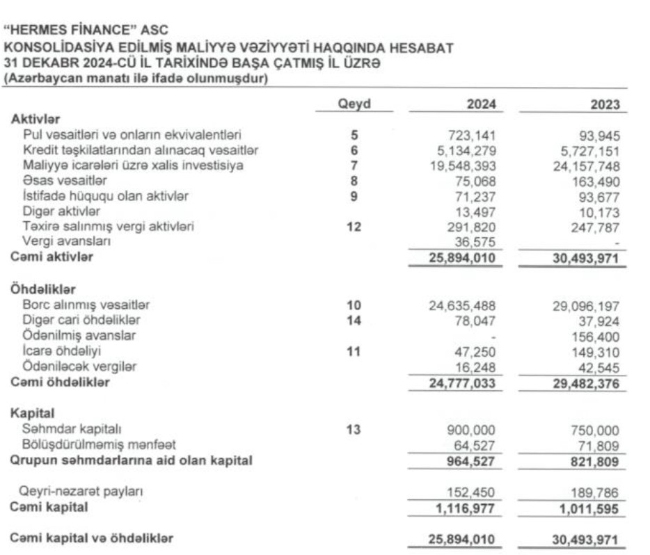 Müxtəlif lizinq paketləri təqdim edən "Hermes Finance" ASC 2024-cü ili 840 min manat xalis mənfəət ilə başa vurub. Şirkət 2023-cü ili 1 milyon 255 min manat xalis mənfəət ilə bağlamışdı. Beləliklə, ötən il "Hermes Finance"ın xalis mənfəəti 415 min manat və ya 33% azalıb.