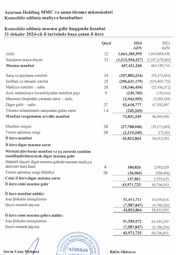 Holdinq 2024-cü ildə 52 milyon 619 min manat digər gəlir də əldə edib (2023-cü ildə 67 milyon 932 min manat digər gəlir əldə etmişdi).