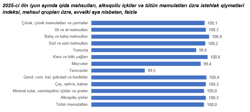 2025-ci ilin iyun ayında qida məhsulları, alkoqollu içkilər və tütün məmulatları üzrə istehlak qiymətləri indeksi əvvəlki aya nisbətən 1,2 faiz azalıb, yanvar-iyun aylarında isə əvvəlki ilin müvafiq dövrünə nisbətən 6,6 faiz artıb.