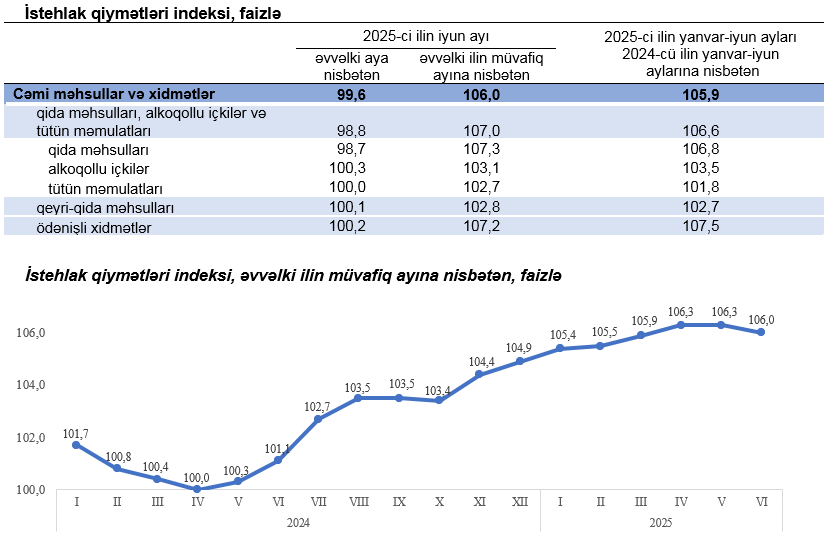 Xatırladaq ki, 2025-ci ilin may ayında istehlak qiymətləri indeksi 2024-cü ilin may ayına nisbətən 6,3 faiz, o cümlədən qida məhsulları, alkoqollu içkilər və tütün məmulatları üzrə 7,8 faiz, qeyri-qida məhsulları üzrə 2,7 faiz, əhaliyə göstərilmiş ödənişli xidmətlər üzrə 7,3 faiz artmışdı.