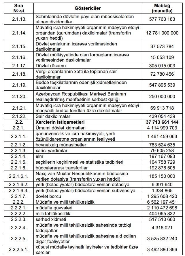 Marja xəbər verir ki, Azərbaycan Respublikasının 2024-cü il dövlət büdcəsinin icrası gəlirlər 37 milyard 161 milyon 838,6 min manat, xərclər 37 milyard 713 milyon 661,1 min manat məbləğində olmaqla təsdiq edilib.