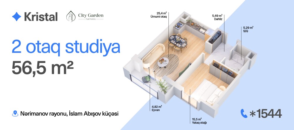 "Kristal"ın "City Garden Narimanov" layihəsində artıq yaşayışa hazır, premium mənzillərin satışına start verilib. Layihə müxtəlif planlamalı və sahəli mənzillərlə alıcılara geniş seçim imkanı təqdim edir.