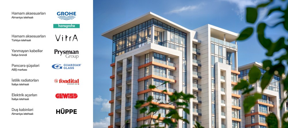 "N. Nərimanov" metro stansiyasına cəmi 5 dəqiqəlik məsafədə yerləşən kompleksdə bütün mənzillər premium materiallarla tam təmir olunur. Almaniya istehsalı Grohe və Hansgrohe, Türkiyə istehsalı Vitra hamam aksesuarları, İtaliya brendi Prysmian yanmayan kabelləri, ABŞ brendi Guardian Glass pəncərə şüşələri, İtaliya istehsalı Fondital radiatorları, İtaliya istehsalı Gewiss elektrik açarları, Almaniya istehsalı Huppe duş kabinləri və digər premium materiallar bu layihənin fərqini ortaya qoyur.