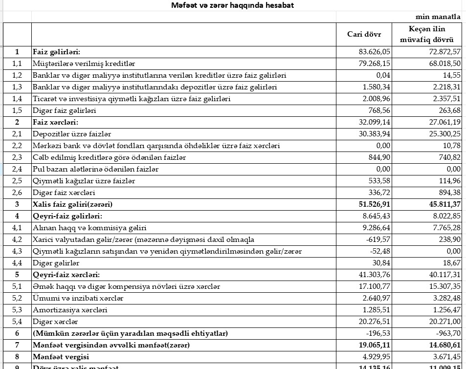 "Bank of Baku" ASC 2025-ci ilin1-ci yarısını (yanvar-iyun) 14 milyon 135 min manat xalis mənfəət ilə başa vurub. Bank 2024-cü ilin eyni dövrünü 11 milyon 9 min manat xalis mənfəət ilə bağlamışdı. Beləliklə, "Bank of Baku"nun xalis mənfəəti 2025-ci ilin 1-ci yarısında 2024-cü ilin 1-ci yarısı ilə müqayisədə 3 milyon 126 min manat və ya 28,4% artıb. Xalis mənfəətin artması gəlirlərin artmasından qaynaqlanır.