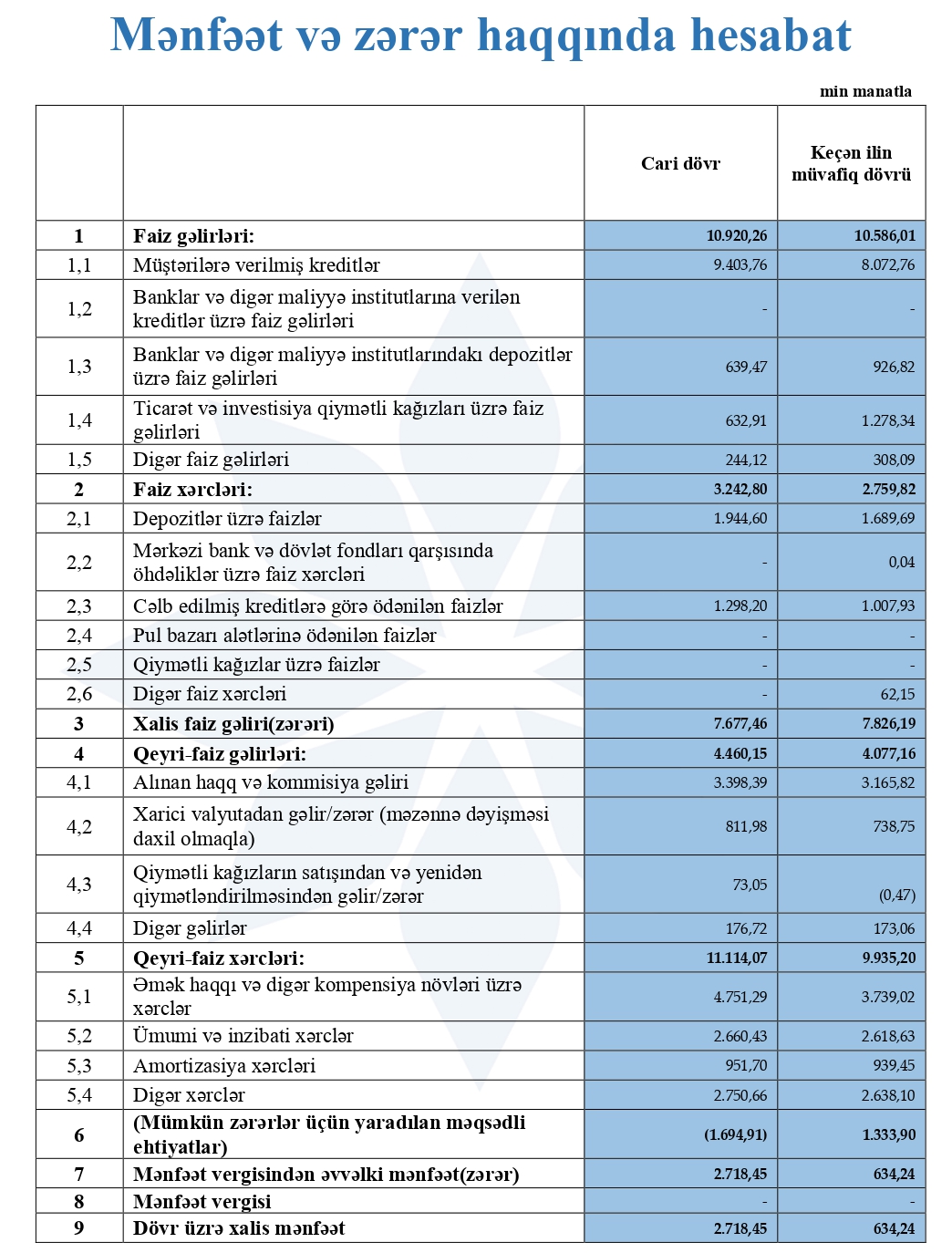 Müqayisə üçün qeyd edək ki, 2024-cü ilin ilk 6 ayı ərzində “AFB Bank”ın cəmi əməliyyat gəlirləri (faiz və qeyri-faiz gəlirləri) 14 milyon 663 min manat, cəmi əməliyyat xərcləri (faiz və qeyri-faiz xərcləri) 12 milyon 695 min manat, gəlirlər xərcləri üstələdiyindən əməliyyat mənfəəti 1 milyon 968 min manat təşkil etmişdi. Bank əməliyyat mənfəətindən 1 milyon 334 min manat mümkün zərərlər üçün yaradılan məqsədli ehtiyatlara ayrılmışdı. Bununla əlaqədar olaraq “AFB Bank”ın mənfəəti 634 min manata düşmüşdü.