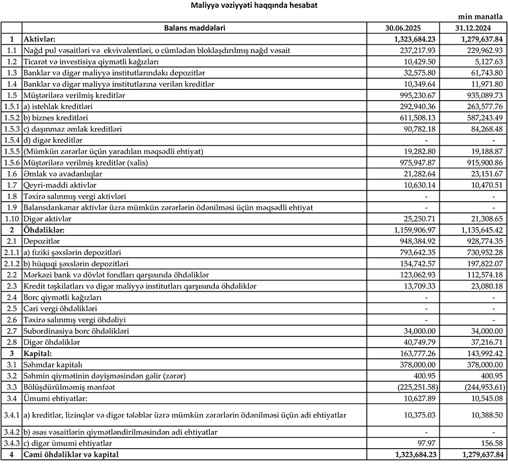 2024-cü ilin sonu ilə müqayisədə 2025-ci ilin 1-ci yarısında “Yelo Bank”ın cəmi aktivləri 44 milyon 47 min manat və ya 3,4% artaraq 30 iyun 2025-ci il tarixində 1 milyard 323 milyon 684 min manata çatıb. Bankın kredit portfeli (müştərilərə verilmiş kreditlər) 60 milyon 141 min manat artaraq 995 milyon 231 min manata, o cümlədən, istehlak kreditləri portfeli 29 milyon 363 min manat artaraq 292 milyon 940 min manata, biznes kreditləri portfeli 24 milyon 265 min manat artaraq 611 milyon 508 min manata, ipoteka kreditləri porteli 6 milyon 514 min manat artaraq 90 milyon 782 min manata yüksəlib.