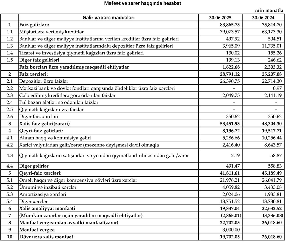 Müqayisə üçün qeyd edək ki, 2024-cü ilin ilk 6 ayında “Yelo Bank”ın cəmi əməliyyat gəlirləri 95 milyon 332 min manat, cəmi əməliyyat xərcləri 72 milyon 699 min manat, gəlirlər xərcləri üstələdiyindən əməliyyat mənfəəti 22 milyon 633 min manat təşkil etmişdi. Mümkün zərərlər üçün yaradılan məqsədli ehtiyatladan azad olmuş 3 milyon 386 min manat mənfəətə əlavə edilmişdi. Ötən ilin 1-ci yarısında “Yelo Bank”ın mənfəət vergisi ödənişi olmamışdı.