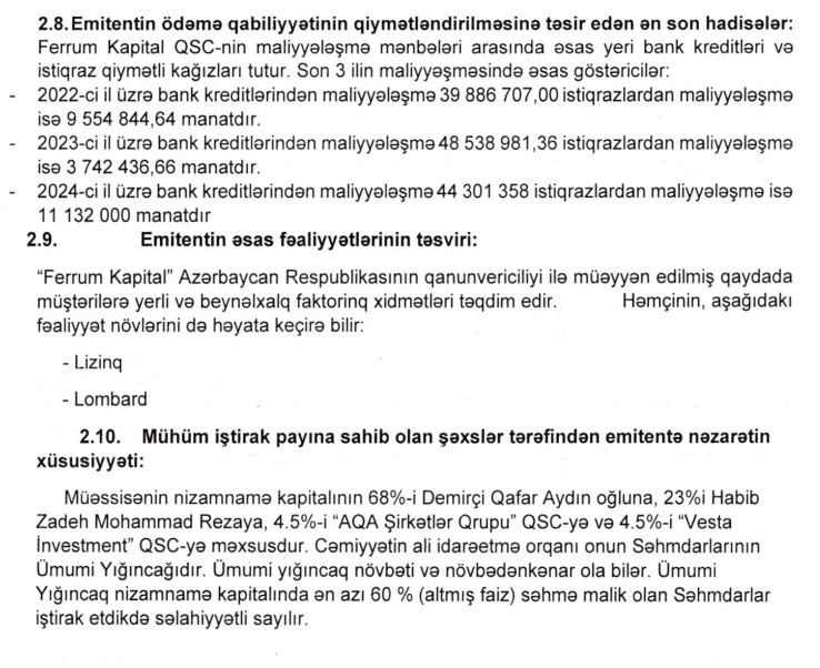 Qeyd edək ki, "Fеrrum Kapital" QSС 1 milyon manatlıq istiqraz buraxıb (hər birinin nominal dəyəri 100 manat оlап 10 000 ədəd, faizli, təmin edilməmiş, sənədsiz, adlı istiqrazlar). İstiqrazlar üzrə faiz dərəcəsi illik 14%, tədavül müddəti 12 ay, faiz ödənişi dövrü 90 gündən birdir.