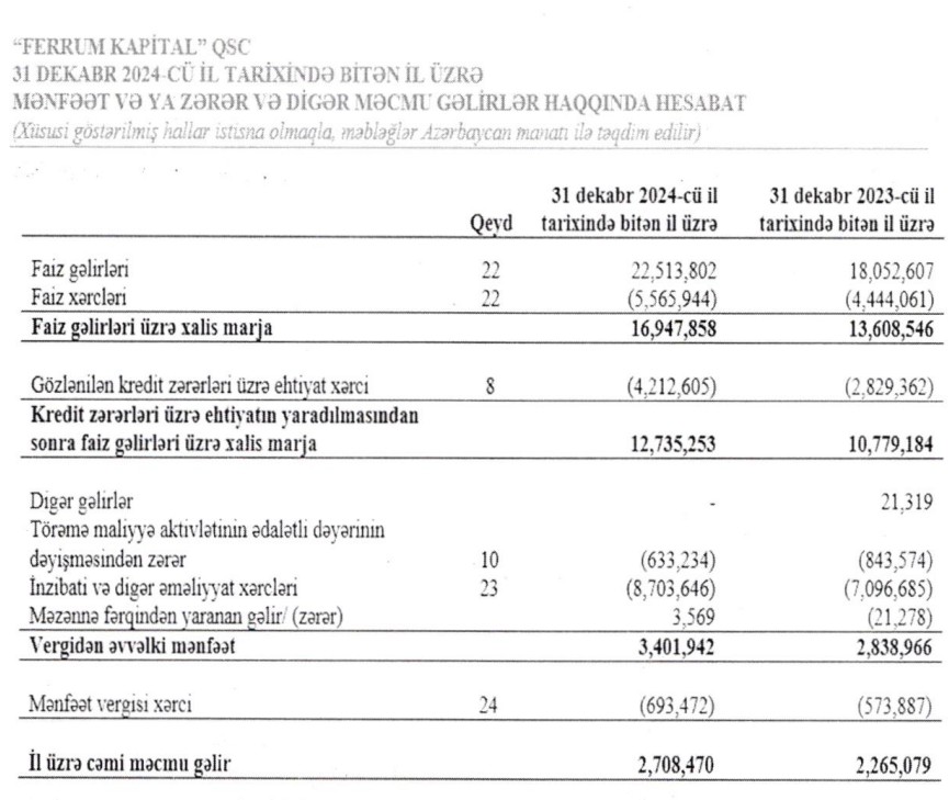 Marja.az xəbər verir ki, "Ferrum Kapital"ın faiz gəlirləri 2023-cü ildə 18 milyon 53 min manat ikən, 2024-cü ildə 22 milyon 514 min manat təşkil edib (4 milyon 461 min manat və ya 24,7% artıb).