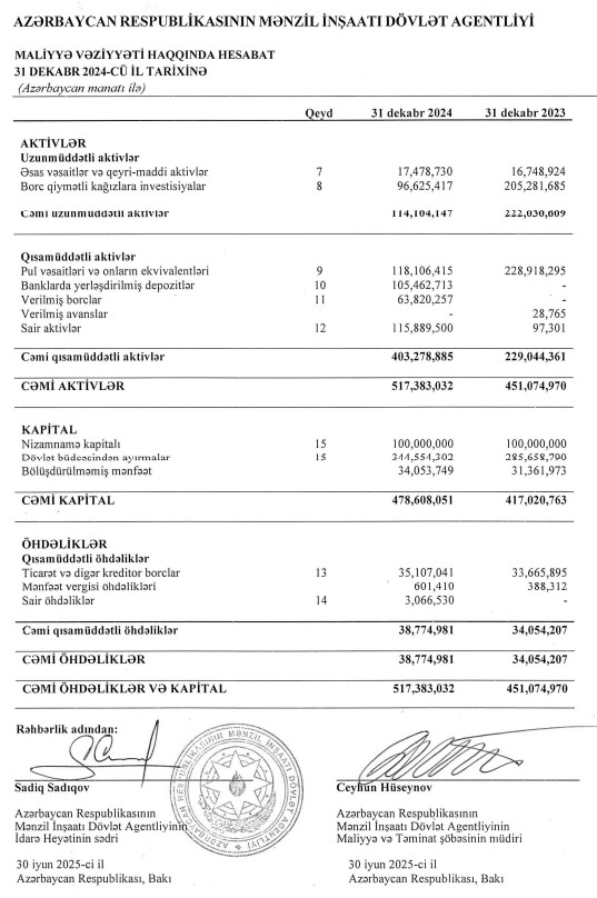 Azərbaycan vətəndaşlarının, xüsusilə az və orta təminatlı vətəndaşların, gənc ailələrin mənzil probleminin həll edilməsi məqsədi çərçivəsində yaradılmış Azərbaycan Respublikasının Mənzil İnşaatı Dövlət Agentliyi borc qiymətli kağızlara investisiyalarını azaldıb, bank depozitlərini artırıb.