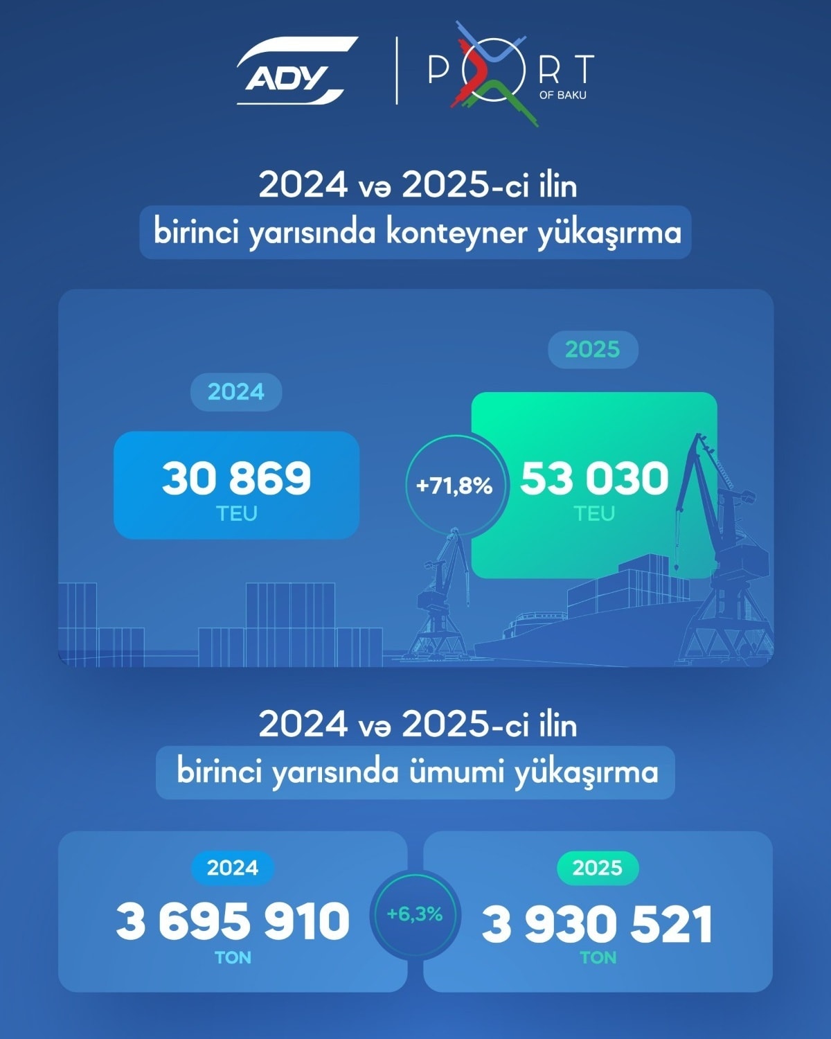 İlin birinci yarısında limanda aşırılmış TEU konteyner (20 fut ekvivalenti) sayı isə 53 mini ötərək2024-cü ilin analoji dövrünün göstəricisini 71,8% üstələyib.