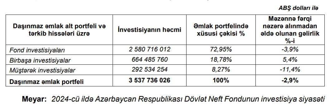 Qeyd edilib ki, daşınmaz əmlak alt portfelinin 2024-cü ildə gəlirliliyi -2,9% təşkil etmişdir. Daşınmaz əmlak alt portfelinin tərkibində müştərək investisiyalar üzrə gəlirlilik -11,4% olmuşdur.