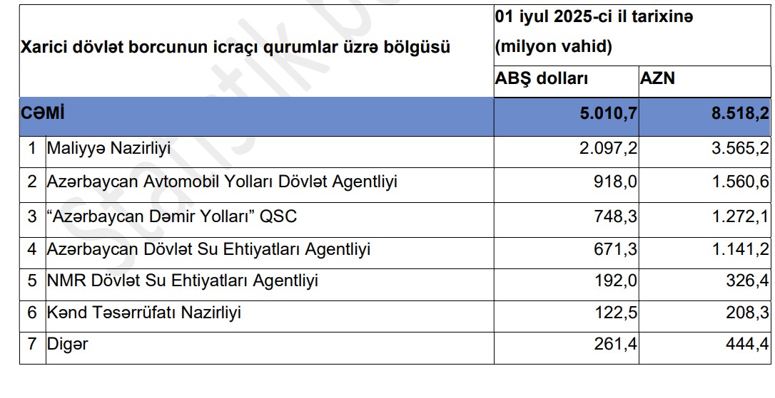 Azərbaycanın bu il iyulun 1-nə 5 milyard 10,7 milyon ABŞ dolları təşkil etmiş xarici dövlət borcunun 14,9 %-i və ya 748,3 milyon dolları “Azərbaycan Dəmir Yolları” QSC-yə aid olub.