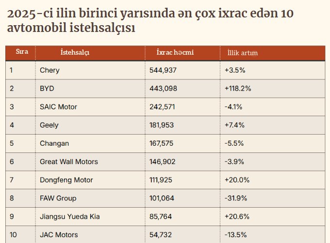 Yiche platformasının məlumatına görə, 2025-ci ilin ilk yarısında Çin avtomobillərinin ixrac olunduğu ilk üç ölkə Meksika, Birləşmiş Ərəb Əmirlikləri (BƏƏ) və Rusiya olub. Meksikaya 234 min 500 ədəd, BƏƏ-yə 214 min 300 ədəd, Rusiyaya isə 171 min ədəd avtomobil ixrac edilib.
