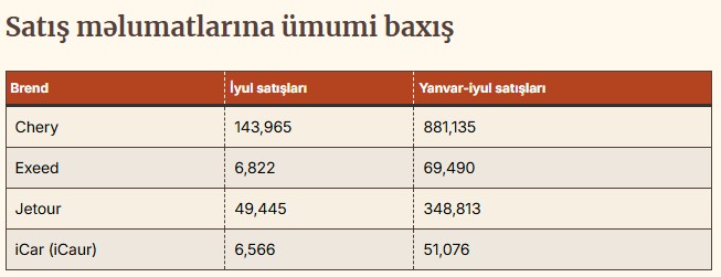Bu ilin ilk yeddi ayında Chery-nin ümumi satışı 1 milyon 484 min 563 avtomobilə çatıb, bu da ötən ilin eyni dövrü ilə müqayisədə 14,5% artım deməkdir. Həmin dövrdə şirkət 669 min 360 avtomobil ixrac edib və bu, onu Çində ixrac üzrə lider mövqeyində saxlayıb.