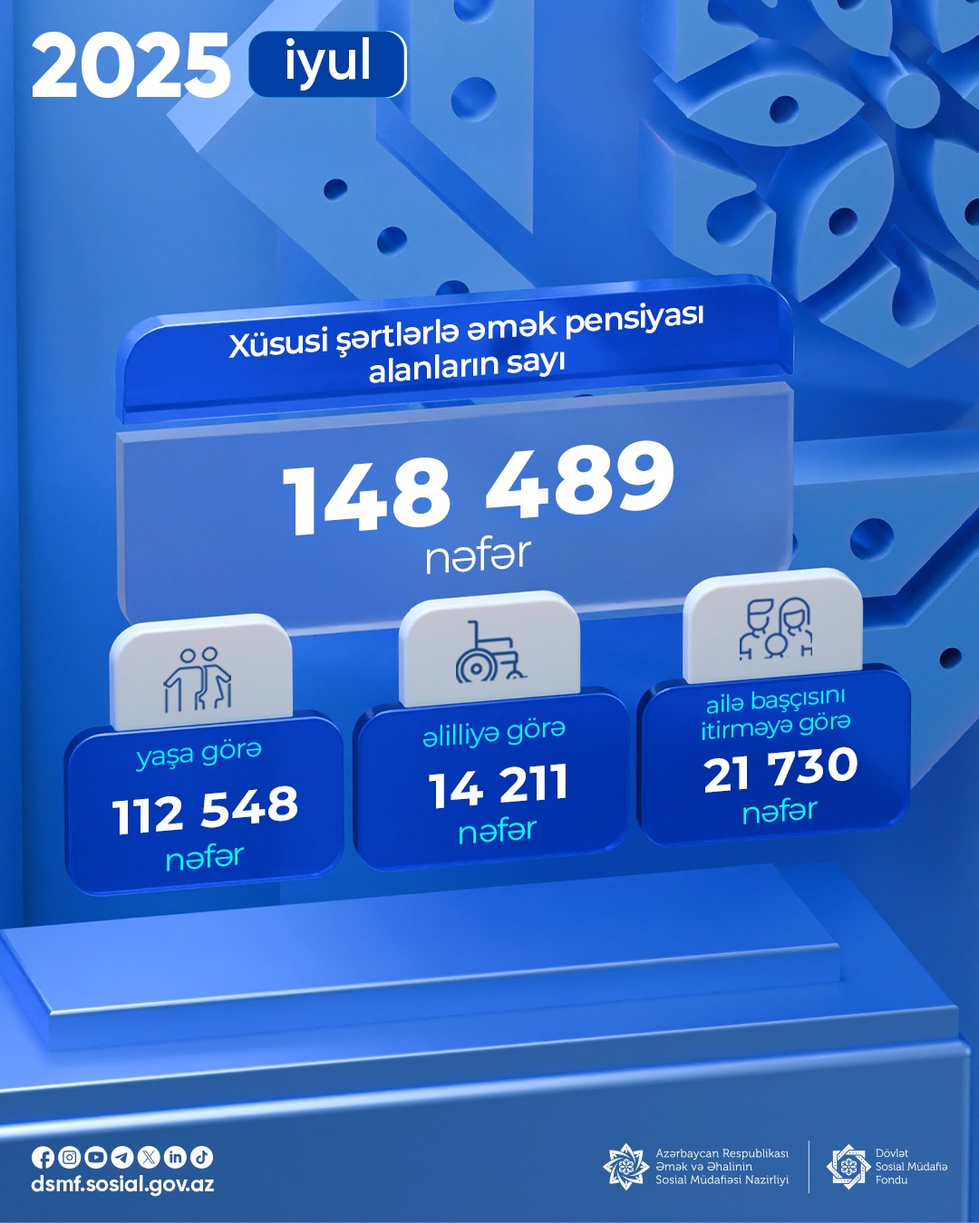 2025-ci ilin iyul ayı ərzində xüsusi şərtlərlə əmək pensiyası alanların sayı 148 489 nəfər olub.