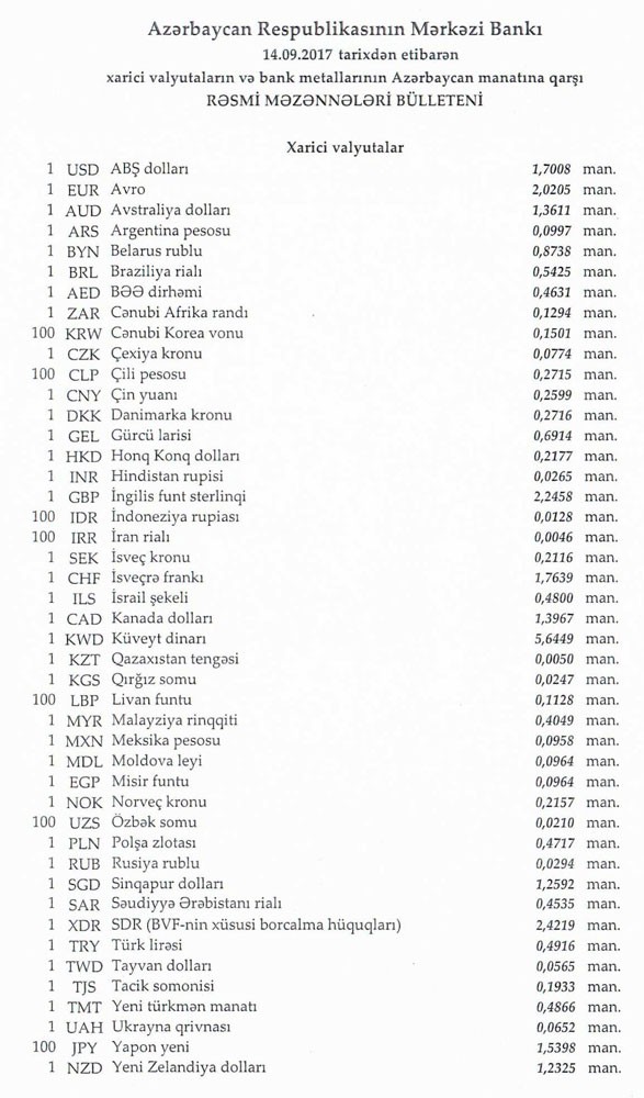 Sentyabrın 14-nə Mərkəzi Bankın açıqladığı rəsmi Dollar/manat məzənnəsi Sentyabrın 13-ü ilə müqayisədə dəyişməyərək 1,7008 manat olub, Avro/manat məzənnəsi isə 2.0205 manata düşüb.