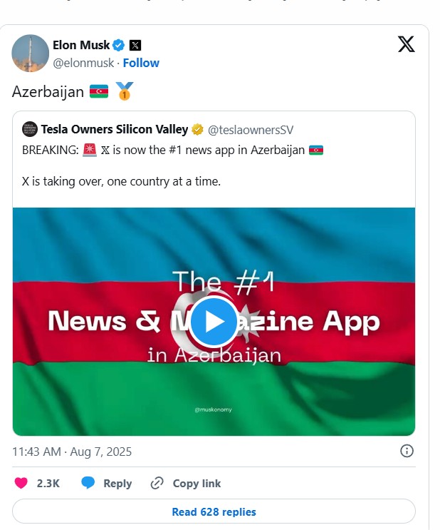 Amerikalı milyarder və sahibkar İlon Mask "X" sosial şəbəkəsində Azərbaycanla bağlı paylaşım edib.