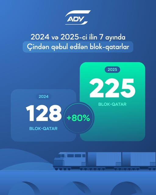 Azərbaycan Dəmir Yolları (ADY) bu ilin 7 ayı ərzində Çindən 225 blok-qatar qəbul edib və ötən ilin eyni dövrü ilə müqayisədə 80% artım qeydə alınıb.