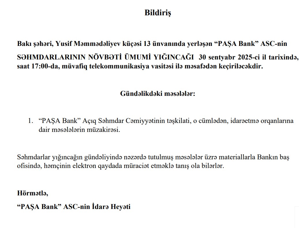 30 sentyabr 2025-ci il tarixində “PAŞA Bank” ASC-ninsəhmdarlarının növbəti ümumi yığıncağı keçiriləcək.