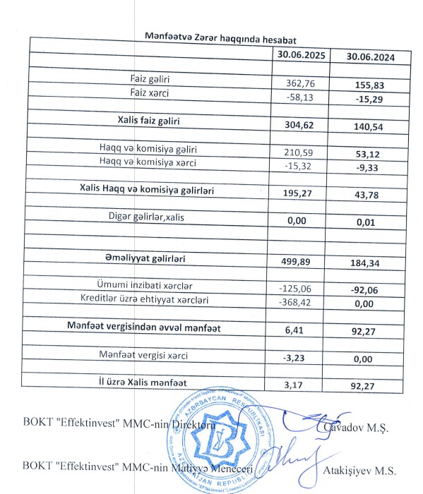 Bank Olmayan Kredit Təşkilatı "Effektinvest" MMC 2025-ci ilin 1-ci yarısını (yanvar-iyun) 3 min manat xalis mənfəət ilə başa vururb. Şirkət 2024-cü ilin 1-ci yarısını 92 min manat xalis mənfəət ilə bağlamışdı. BOKT-ın xalis mənfəətinin azalması kreditlər üzrə ehtiyat xərclərilə əlaqədardır.