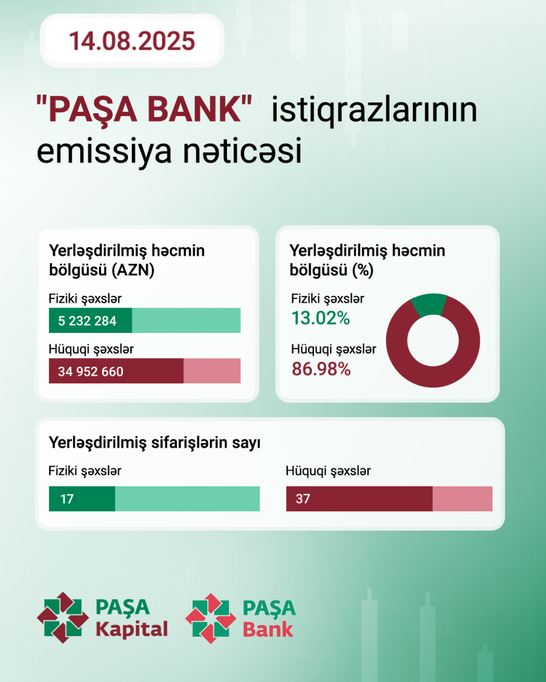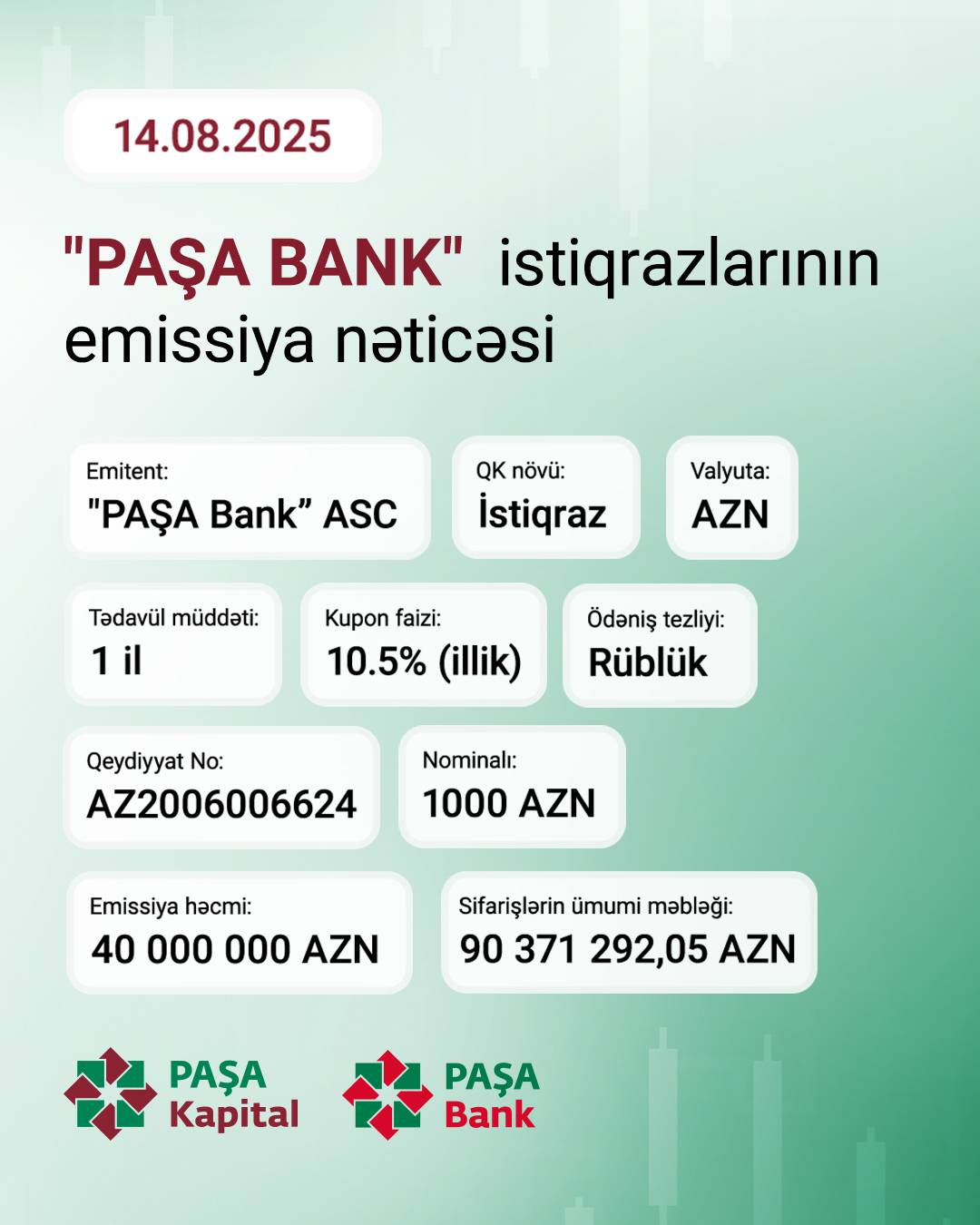 Şirkət, korporativ maliyyə sahəsində 18 ildən artıq təcrübəyə malik və etibarlı tərəfdaş kimi tanınan PAŞA Bank-ın istiqrazlarının ilkin yerləşdirilməsini uğurla tamamlayaraq, sifarişlərin ümumi məbləğinin 90 milyon 371 min 292,05 AZN təşkil etməsini təmin edib. Bu da emissiya həcmini iki dəfədən artıq üstələyib.