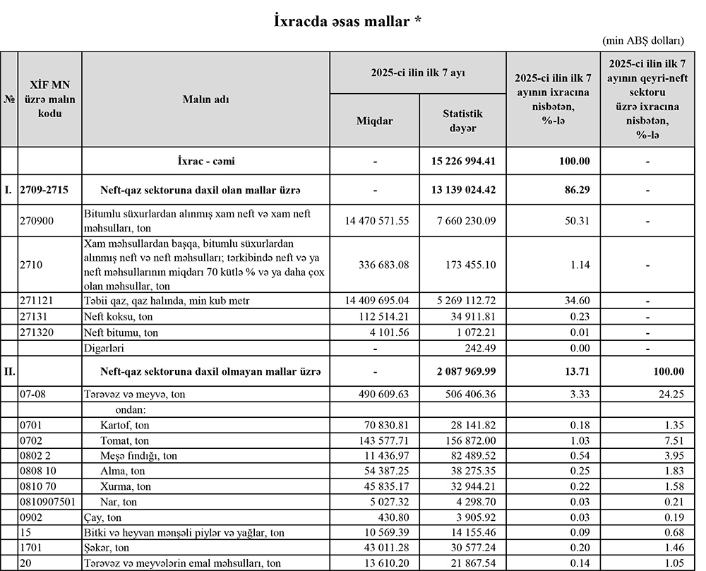 2025-ci ilin 7 ayı ərzində (yanvar-iyul) Azərbaycandan 13 milyard 139 milyon 24 min dollar dəyərində neft-qaz sektoruna daxil olan mallar ixrac olunub ki, bu da ötən ilin eyni dövrü ilə müqayisədə 1 milyard 85 milyon 242 min dollar və ya 7,6% azdır. Azalma xam neft satışından daxil olan valyuta məbləğinin düşməsilə əlaqədardır.