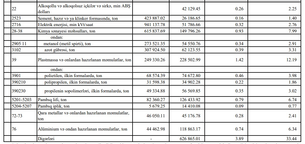 Təbii qaz ixracı isə 513 milyon 345 min dollar və ya 10,8% aratarq 5 milyard 269 milyon 112 min dollar təşkil edib.