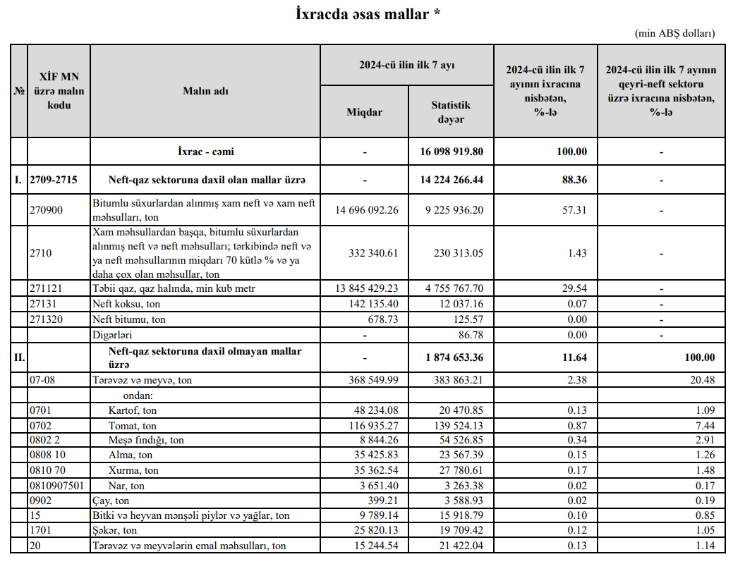 Xatırladaq ki, 2024-ci ilin ilk 7 ayı ərzində Azərbaycandan 14 milyard 224 milyon 266 min dollarlıq neft-qaz sektoruna daxil olan mallar, o cümələdən 9 milyard 225 milyon 936 min dollarlıq xam neft və 4 milyard 755 milyon 767 min dollarlıq təbii qaz ixrac edilmişdi.